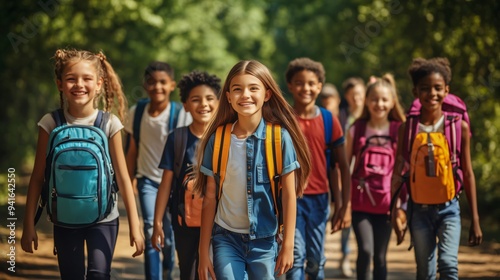 Elementary school students happily stroll along a park path, enjoying each other's company