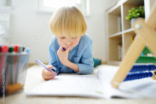 Elementary student boy doing homework at home. Child learning to count, solves arithmetic examples, doing exercises in workbook. Math tutorial. Preparing preschooler baby for school. Education