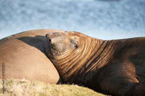 elephant seal relaxing in the later afternoon sunshine on sea lion island, falkland islands, south atlantic