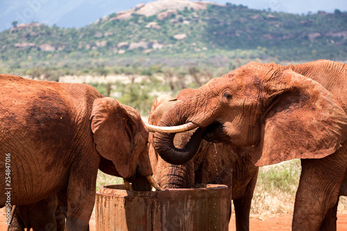 Elephants drink water from a water tank