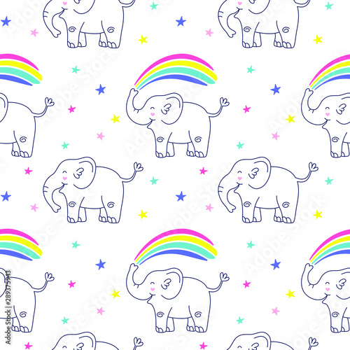 Elephants launch a rainbow and colored stars. Children seamless pattern for fabric, background, gift paper, wallpaper. Cute vector illustration.