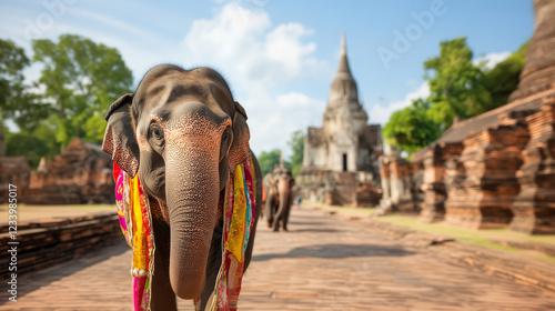 Elephants Roaming the Ancient Streets of Ayutthaya. Illustrate a picturesque scene of elephants roaming the streets of Ayutthaya, Thailand, where ancient temples and historic ruins
