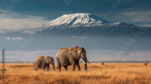 Elephants traverse golden grasses under the snowy peak of a large mountain range