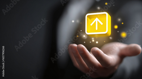 Elevate Your Vision: Hand holding upward arrow icon, symbolizing growth, advancement, and aiming high. Let's move forward together!
