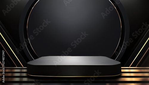 Elevated Luxury Sleek, Minimalistic 3D Studio Backdrop Empty Black Product Podium on Glossy Wood Platform Showcasing a Modern Stage for HighEnd Presentations and Premium Event Spaces.