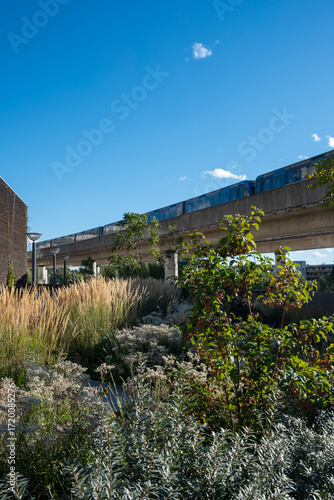 Elevated metro viaduct crossing over green landscaped area in Kista Stockholm, clear sky and modern infrastructure highlighting sustainable urban transport solutions