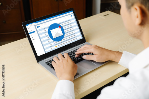 Email notification message showing on computer screen snugly. Digital marketing message information text from business to customer client