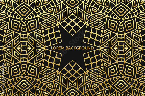 Embossed black lorem background, cover design, banner. Geometric vintage gold 3D pattern. Tribal designs, arabesques, handmade. Ethnic style of the East, Asia, India, Mexico, Aztec, Peru.