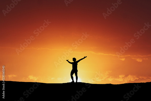 Embracing the Sunset: A silhouette of a person stands with arms outstretched against the backdrop of a vibrant fiery sunset, capturing a moment of triumph, peace, or profound inspiration.