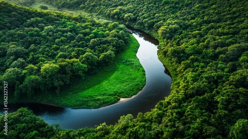 Emerald Embrace: Aerial view of a serene river winding through a lush forest, a testament to the captivating interplay of water and vibrant flora