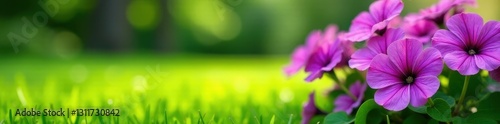 Emerald green lawn, vibrant purple petunias bloom , nature, horticulture