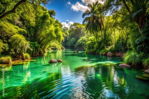 Emerald Lagoon: Lush greenery, hidden hippos, shimmering water, vibrant and serene mood, high contrast