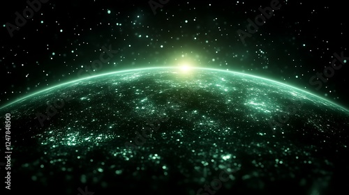 Emerald Planet Sunrise Glowing Lights Cosmic Dust