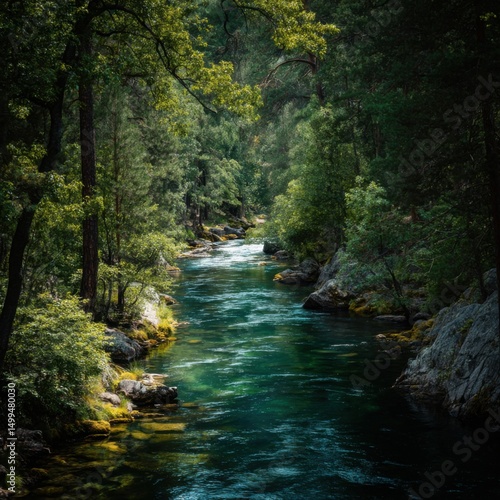 Emerald River Flowing Through Lush Forest Landscape Overhead Shot in Yosemite National Park California