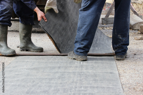 emergency water service team cuts pieces of roofing material for wrapping the water pipe at the accident site for thermal insulation. reportage photography, Russia