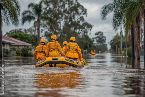 Emergency workers rescuing elderly people on inflatable boats through flooded suburban areas.