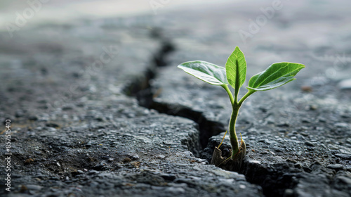 Emerging from adversity, a new beginning takes root. A cracked surface represents challenges, but a green sprout symbolizes growth and recovery in the face of economic crisis.
