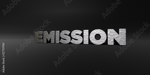 EMISSION - hammered metal finish text on black studio - 3D rendered royalty free stock photo. This image can be used for an online website banner ad or a print postcard.