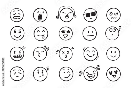 Emoji face icon doodle set. Faces with different emotion mood. Hand drawn comic sketch style.