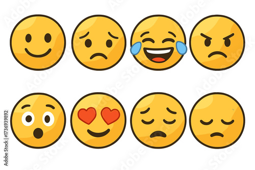 Emoji set vector illustration. Emoticon face collection. Cute cartoon character icon with various emotions. Happy, sad, angry, love, laugh, surprised. Mood expression symbol.