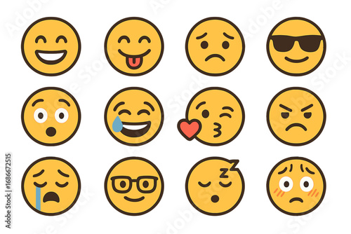 Emoji set vector illustration. Flat cartoon smiley faces collection with many emotions. Happy, sad, love, angry, surprised and cool emoticon icons pack for social media.