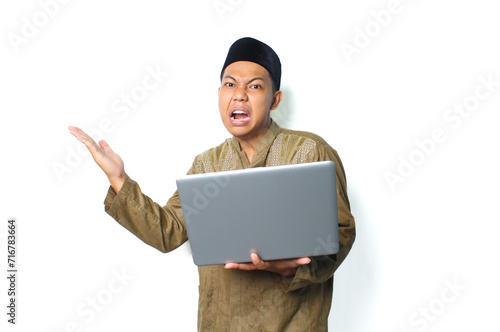 emotional asian muslim man presenting to beside with holding laptop wearing islamic clothes isolated on white background
