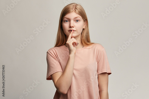 Emotional beautiful woman with attractive appearance, keeps finger on lips, shows silence gesture, asks not to gossip. close up photo. studio shot