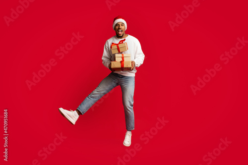Emotional black guy in red Santa hat jumping with presents