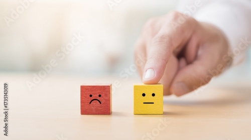 Emotional Choice: A hand interacts with wooden cubes depicting contrasting moods, symbolizing decision-making in an environment of emotions and choices.