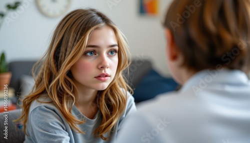 Emotional conversation between two young women cozy living room intimate portrait homely atmosphere close-up view connection