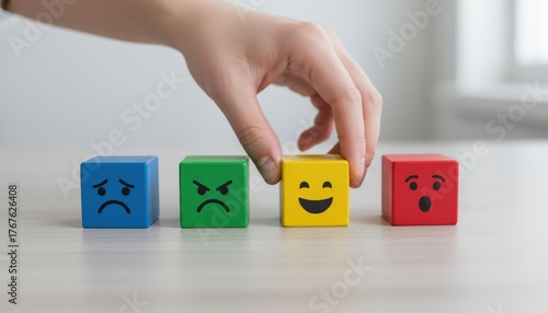 Emotional Cubes Selection: A hand delicately selects a vibrant, emotion-laden cube from a series of colorful blocks, embodying a choice in the realm of feelings, and promoting emotional intelligence.