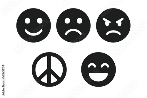 Emotional icons grid. Solid, filled icon set of emotional contrast. Happy face, sad face, anger icon, peace symbol, laughter icon. Vector illustration for web and apps.