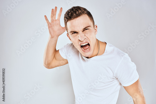 Emotional man gestures with his hands displeasure white t-shirt light background