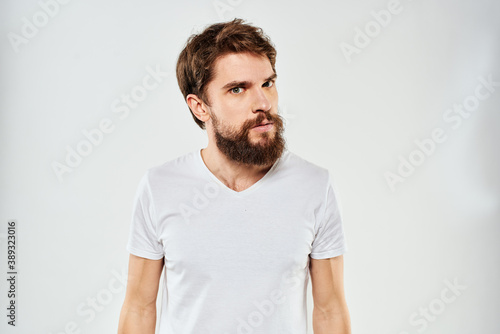emotional man with a beard gesturing with his hands close-up studio aggression