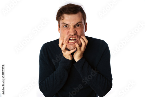 emotional portrait of a crazy man in close-up. concept: the nervous breakdown, mental disease, headaches and migraine. isolated on white background.
