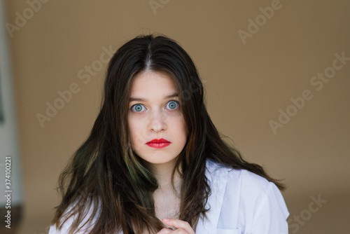 Emotional portrait of surprised woman. Amazement emotion. Studio isolated shooting.