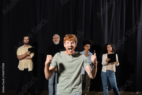 emotional redhead man showing thumb up and screaming near multiethnic students and teacher of acting skills on background.