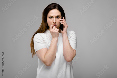 Emotional sad puzzled plus size model standing in studio looking in camera talking on phone with friend