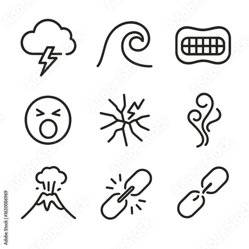 Emotional Turbulence Icons. Outline icon set of emotional turbulence: storm cloud, flashing lightning, rolling wave, clenched jaw,