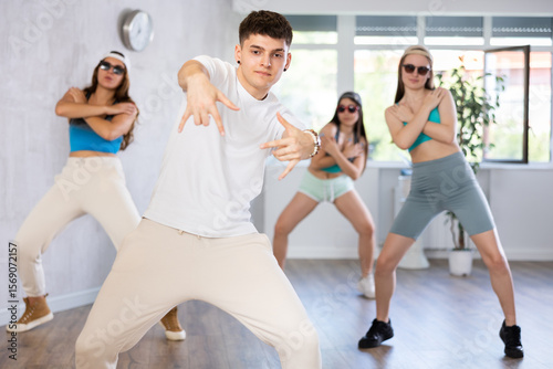 Emotional young b-boy dancing with group of female friends in dance studio. Hip-hop generation..