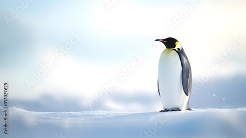 Emperor penguin standing majestic in bright Arctic landscape, pristine snow-covered ground, soft diffused sunlight, crystal clear air, light snowfall, pale blue sky.