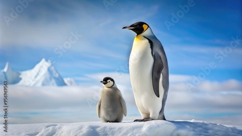 Emperor penguin with chick standing on the snowy hill of an island in Antarctica, Antarctica, Antarctic Peninsula, penguin, chick