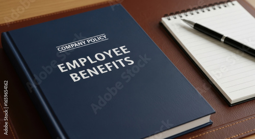 Employee benefits company policy document and notepad on a wooden tabletop surface
