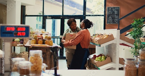 Employee bringing supply of freshly harvested produce at local supermarket, talking to vendor about sustainable lifestyle. Supplier holding crates of goods, woman receiving products. Handheld shot.