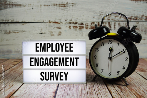 Employee Engagement Survey text on light box with alarm clock on wooden background