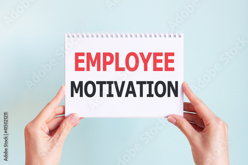 EMPLOYEE MOTIVATION word inscription on white card paper sheet in hands of a woman. Business concept