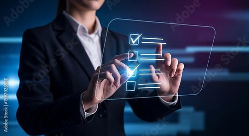 Employee offboarding concept. An HR professional checks off the last item on a simple, holographic exit checklist for a departing employee.