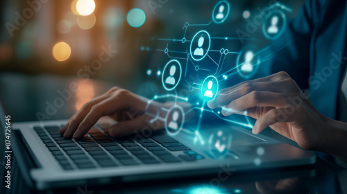 Employee recruitment concept. Someone interacts with a laptop showing a virtual job fair icon for recruiting and onboarding programs, surrounded by a bustling job fair environment with companies