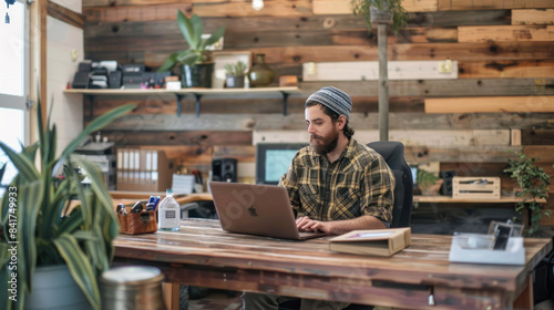 Employee working at a desk made from reclaimed wood