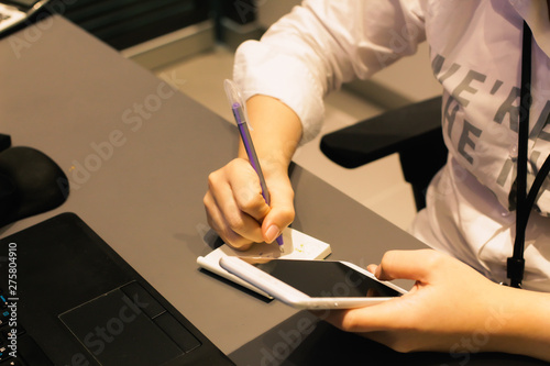 Employees are listing products in the store for the phone customers buy. Women's hand.